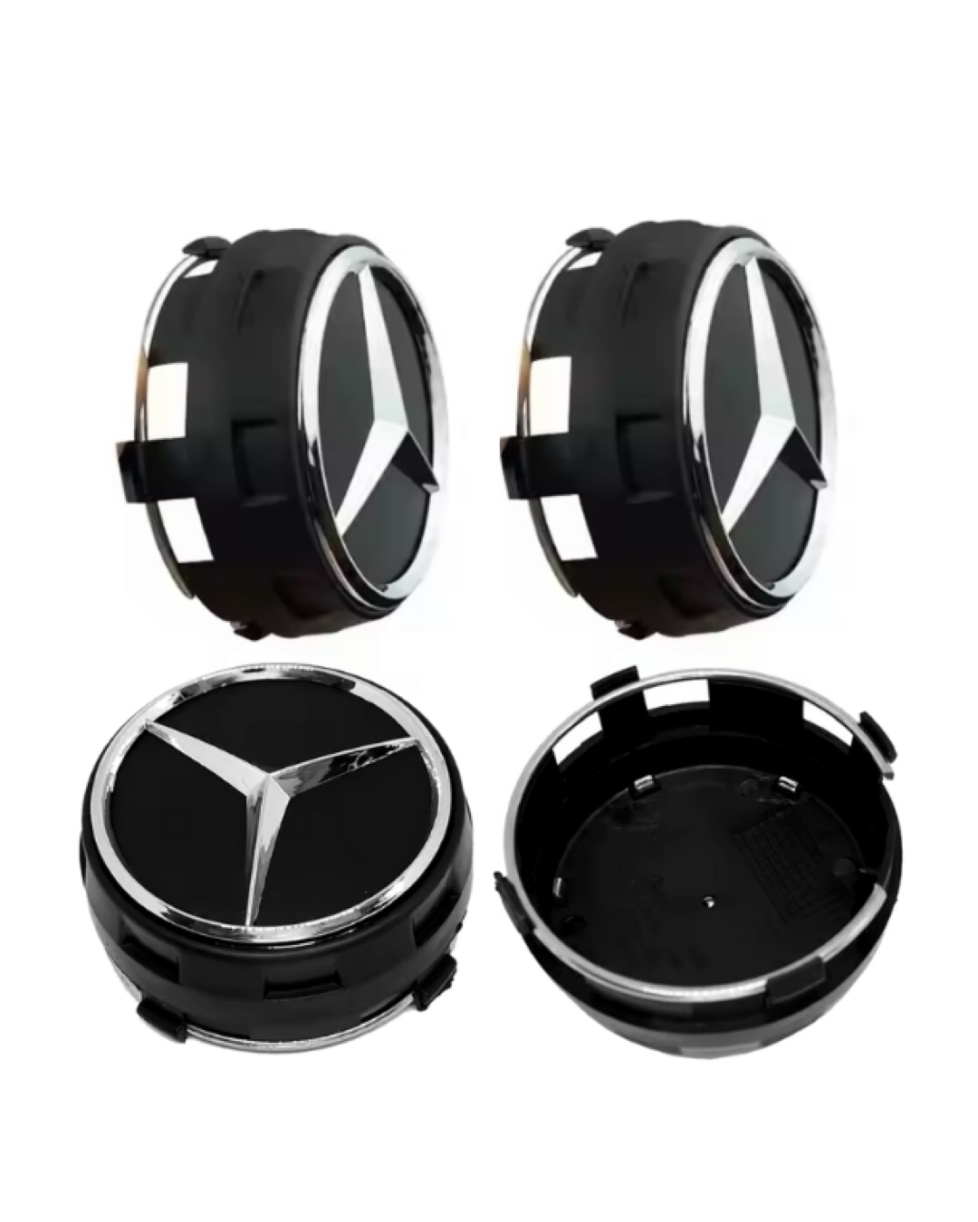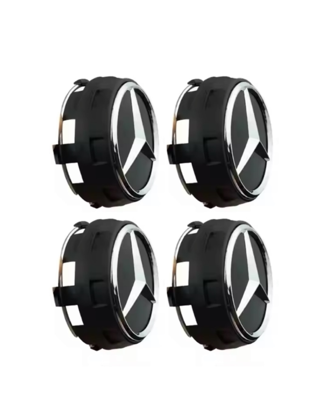 Komplett set som innehåller fyra mattsvarta kåpor som är designade för att passa de flesta Mercedes-modeller med standard 75 mm nav.