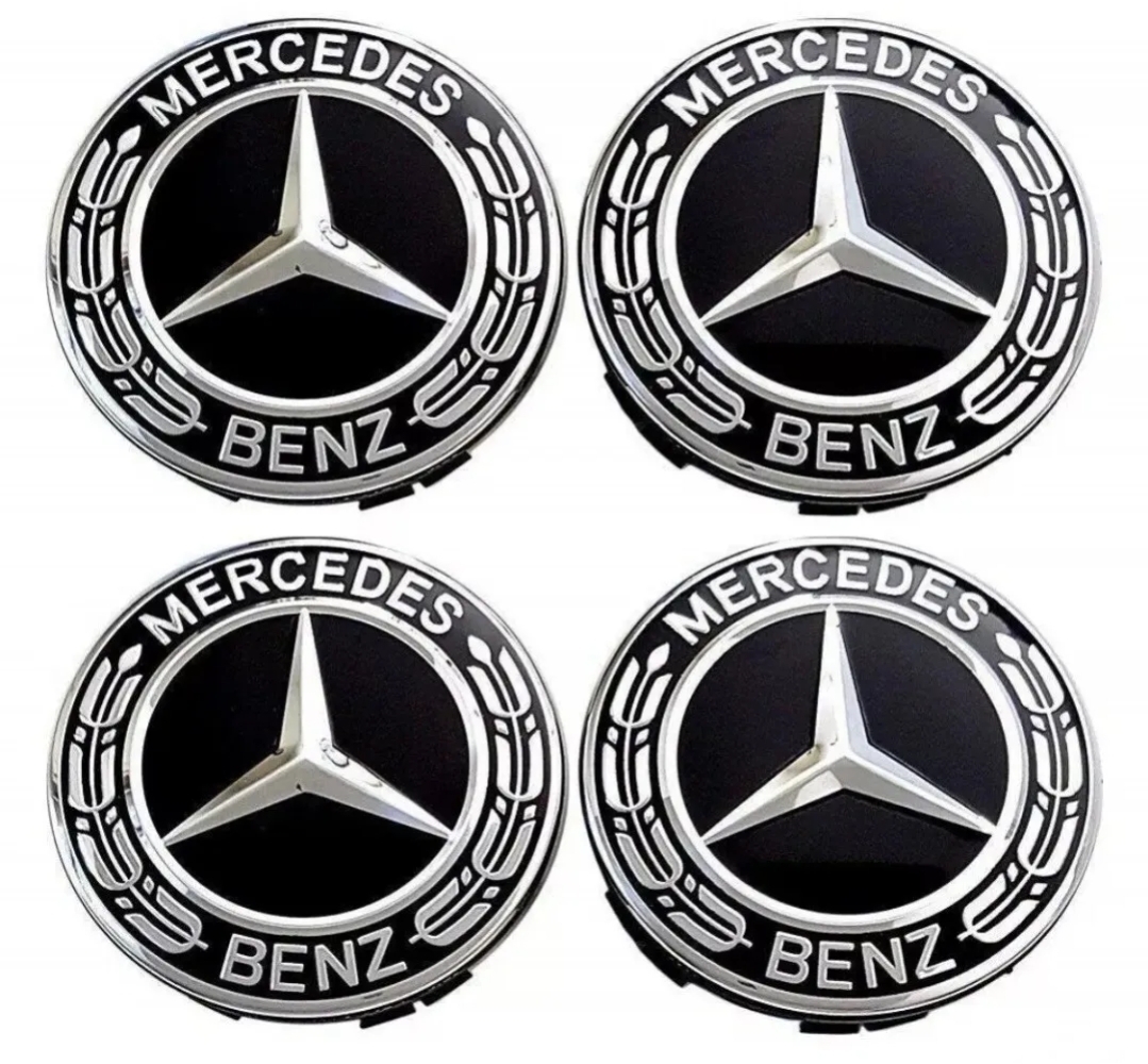 4st Mercedes centrumkåpor i svart/silver färg som passar de flesta Mercedes modeller med 75mm nav.