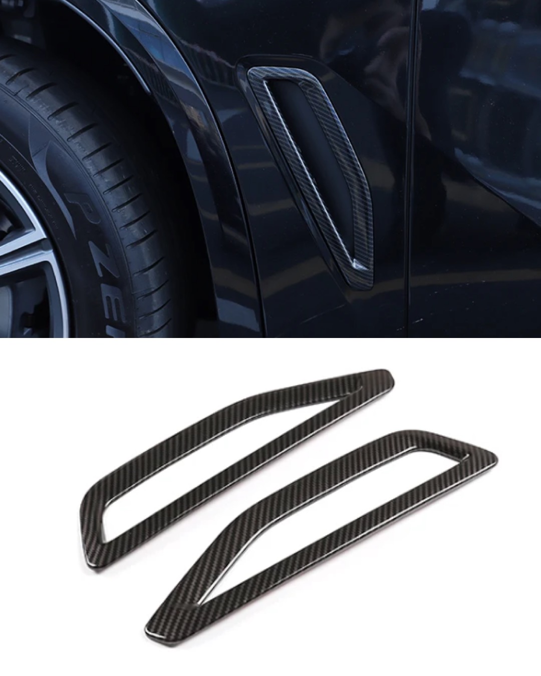 BMW X5 G05 överlägg i ”kolfiber” passande X5 2019-2023. Dubbelkolla så att det är likadana intag på din bil som på bilden. Kommer i ett 2-pack, en till varje skärm. Sätts över de befintliga, inga verktyg eller demonteringar krävs. Sätts dit med hjälp av den dubbelhäftande tejpen som finns på baksidan.