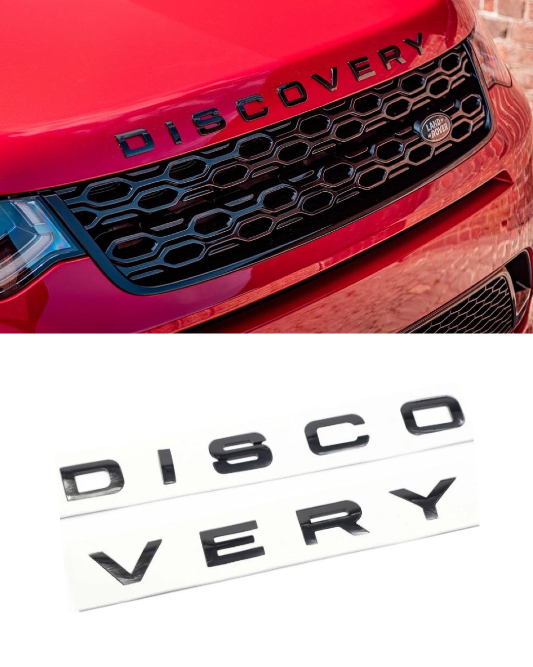 Land Rover Discovery emblem i blank svart som kan monteras på både framsidan och baksidan av bilen. Samma storlek som original. Kommer med dubbelhäftande tejp på baksidan av bokstäverna för en enkel montering.