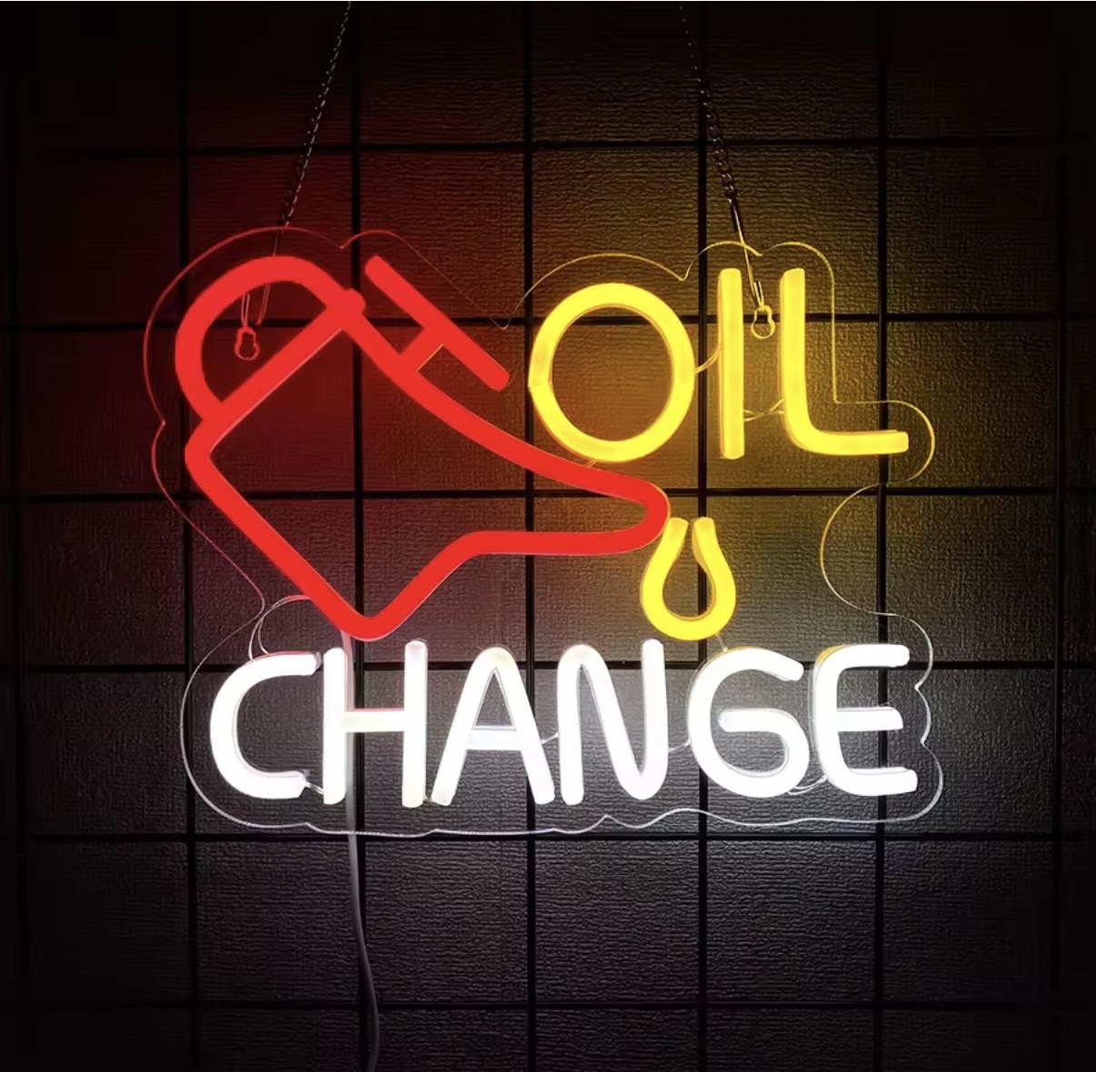 Ge din verkstad, garage eller butik en retroinspirerad känsla med denna Oil Change LED-neonskylt i rött, gult och vitt. Den stilrena designen med oljekanna och texten “Oil Change” gör den perfekt som både dekoration och praktisk skyltning.