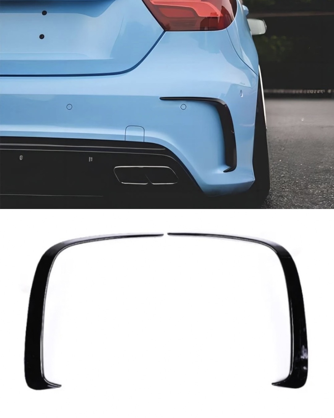 Svarta så kallade fenor/splitters till Mercedes A klass W176 som sätts över/vid ditt luftintag. Kommer i 2-pack för montering på vardera sida. Monteras super enkelt med hjälp av den dubbelhäftande tejpen som finns baksidan, ingenting behöver skruvas av eller på.