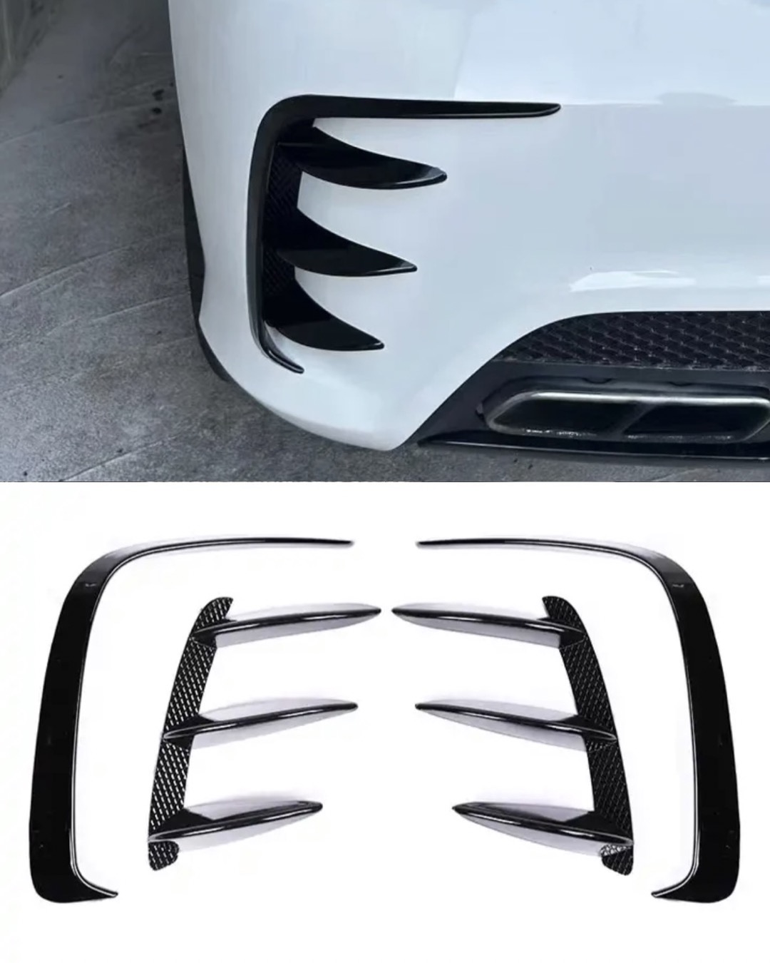 Svarta så kallade fenor/splitters till Mercedes A klass W176 som sätts över/vid ditt luftintag. Kommer i 2-pack för montering på vardera sida. Monteras super enkelt med hjälp av den dubbelhäftande tejpen som finns baksidan, ingenting behöver skruvas av eller på.