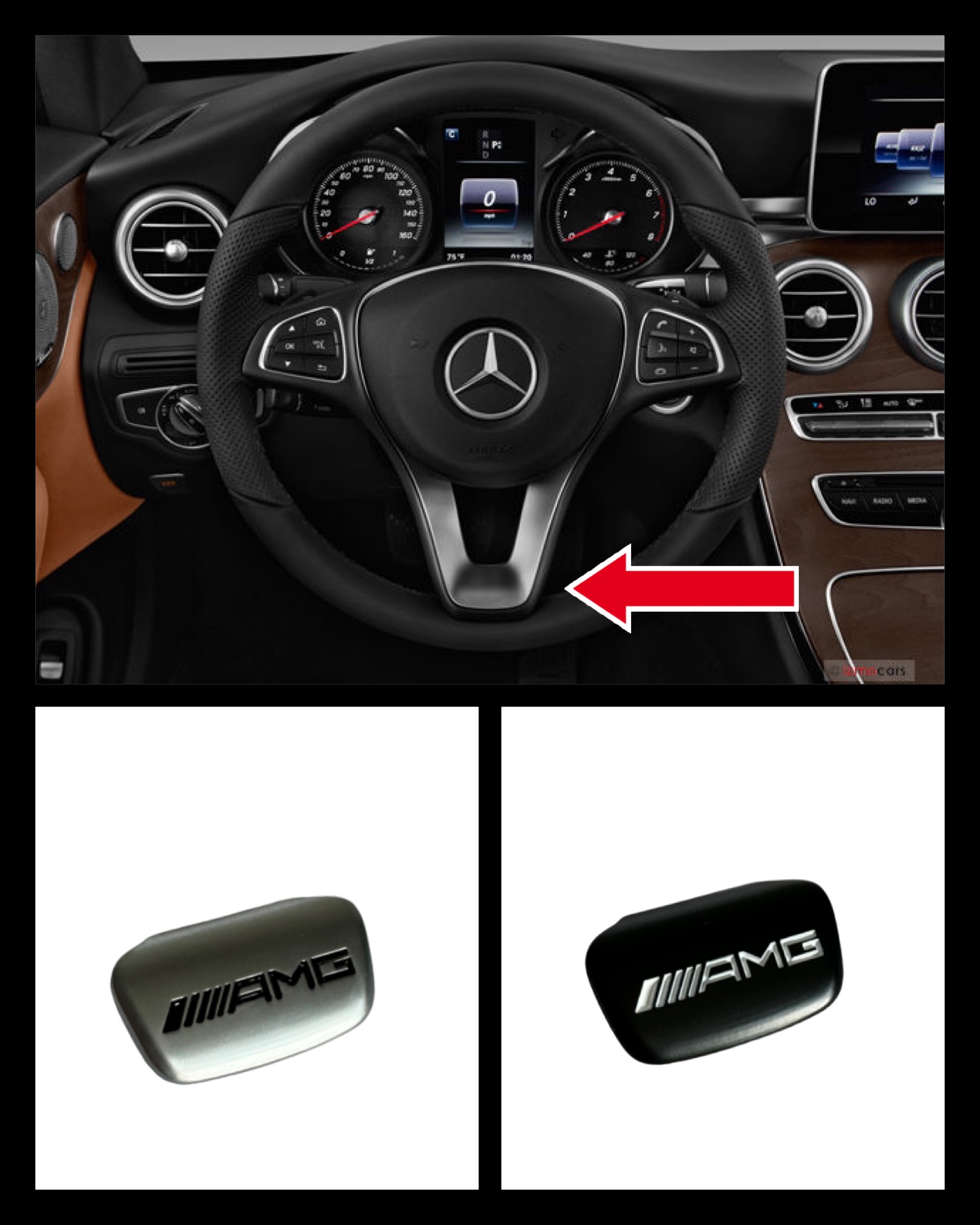 En AMG produkt till ratten som sätts ditt enkelt med dubbelhäftande tejp som medföljer baksidan av delen. Höjer rattens utseende. Till Mercedes.