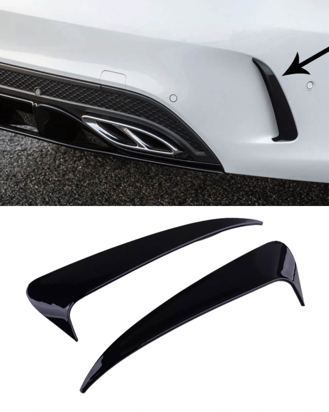 Svarta så kallade fenor/splitters till Mercedes C klass W205 som sätts över/vid ditt luftintag. Kommer i 2-pack för montering på vardera sida. Monteras super enkelt med hjälp av den dubbelhäftande tejpen som finns baksidan, ingenting behöver skruvas av eller på.