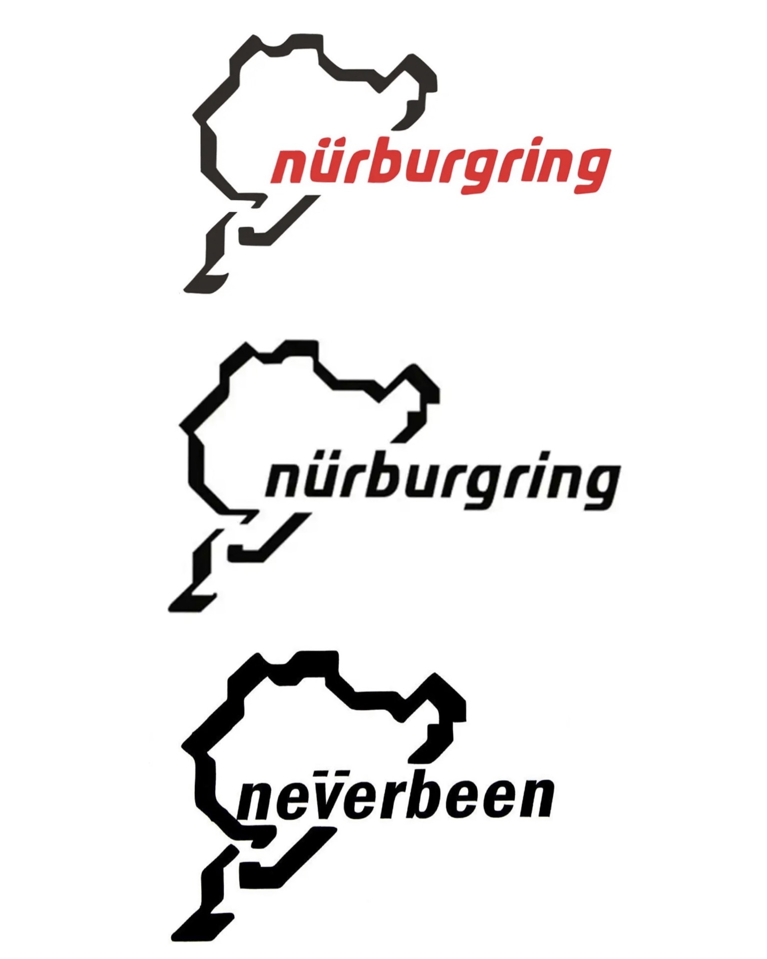 Neverbeen: För den med lite humor, kan sättas antingen på eget fordon eller köpas till tillexempel vännen som alltid pratat om Nurburgring men aldrig varit där. Även denna dekal finns i två olika färger, välj bland antingen svart eller vit.