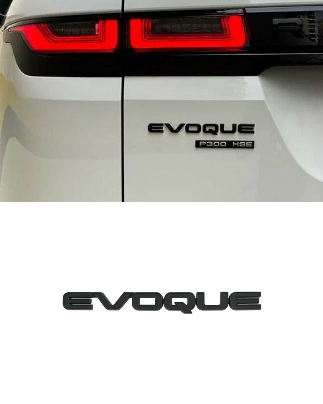 Range Rover Evoque emblem i blank svart som kan monteras på baksidan av bilen. Samma storlek som original. Kommer med dubbelhäftande tejp på baksidan av bokstäverna för en enkel montering.