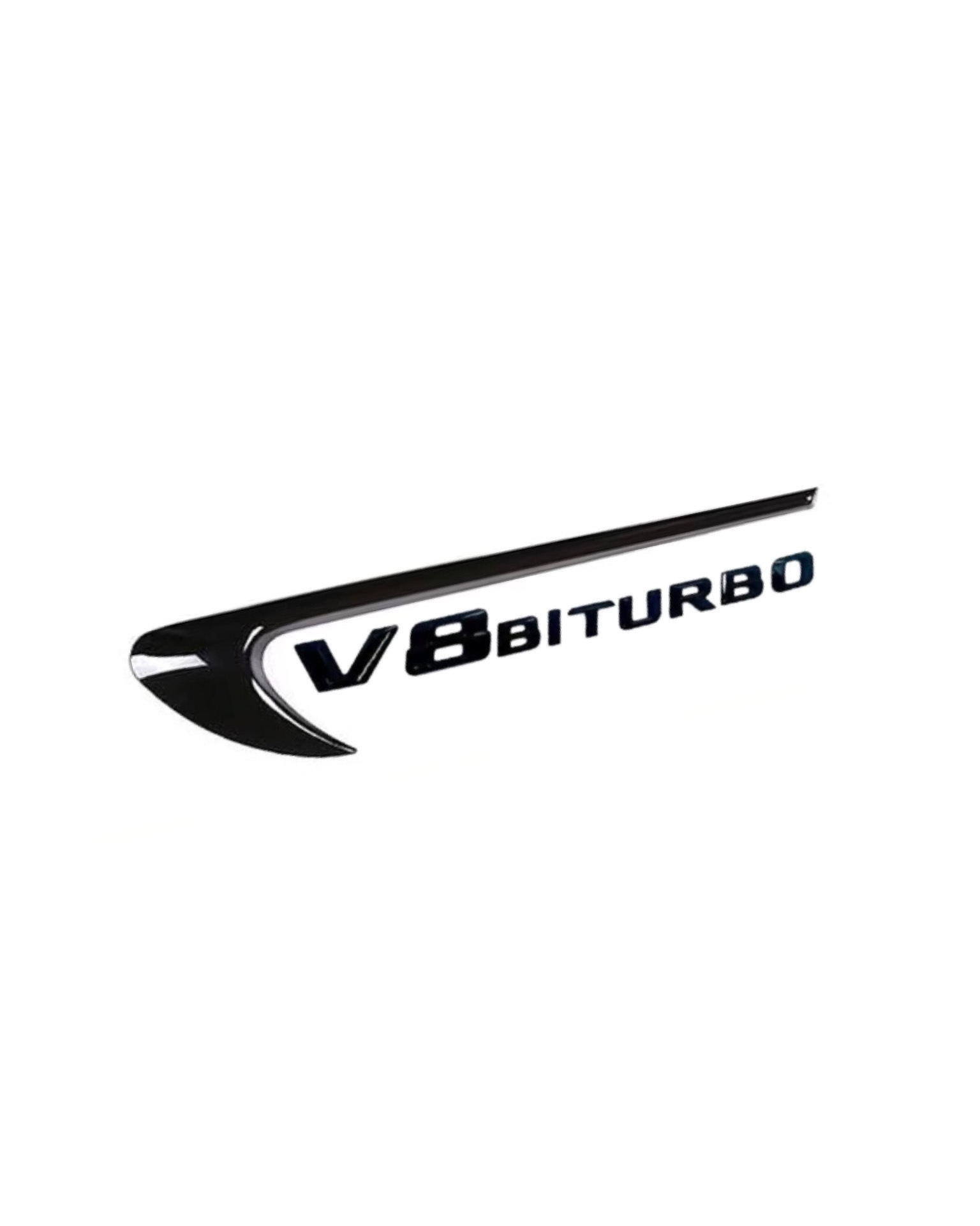 Ett svart V8 biturbo emblem med emblem till luftintag till Mercedes AMG bilar, monteras på skärmarna vid luftintaget.