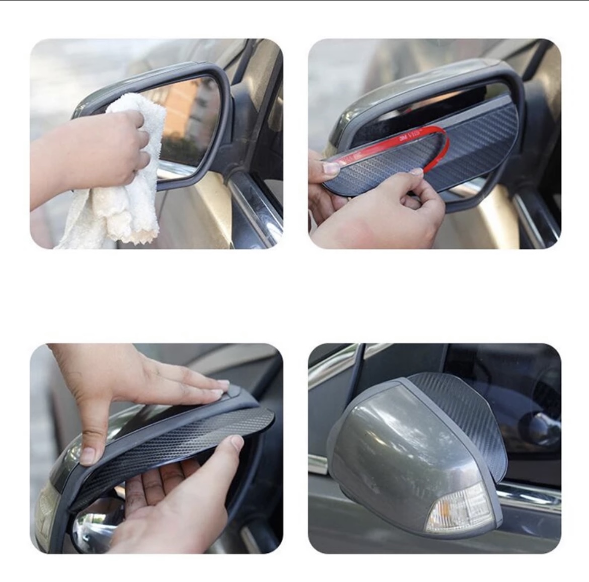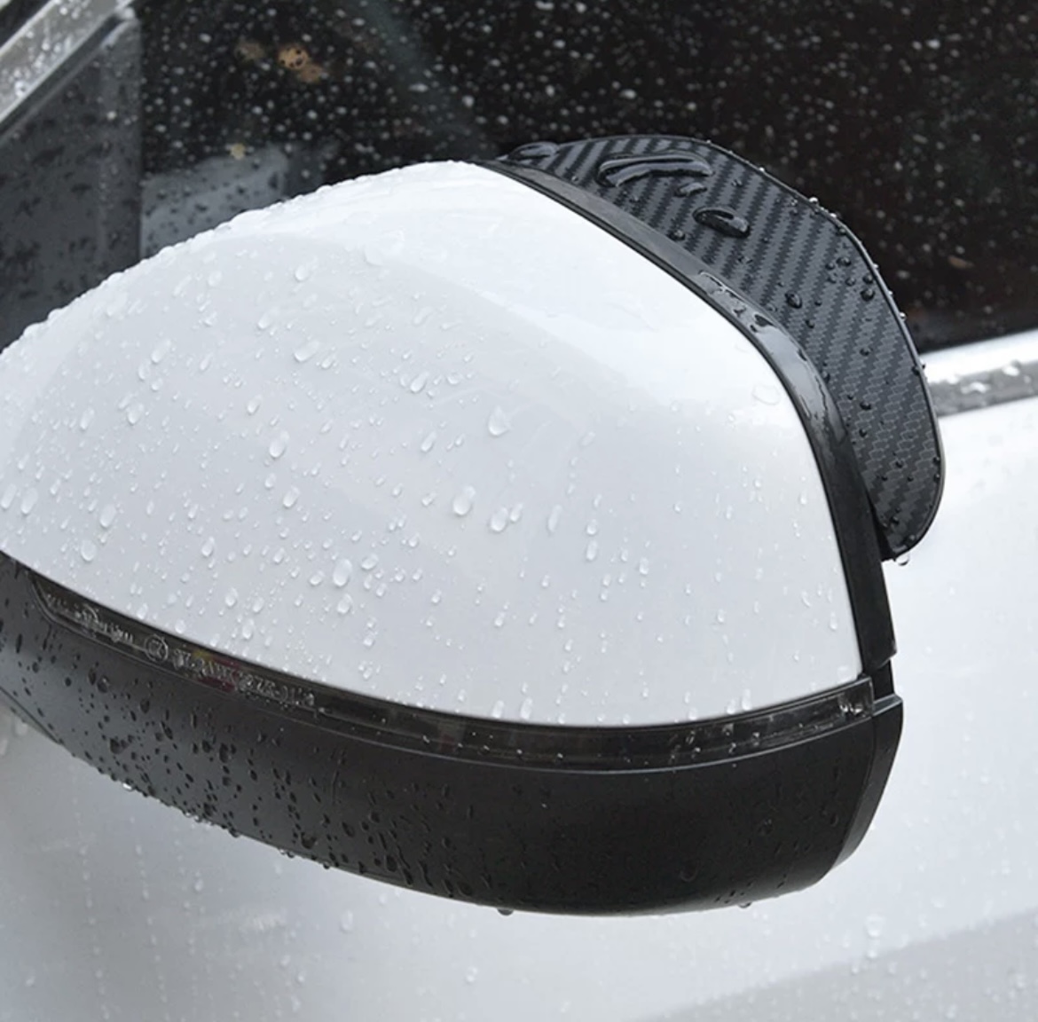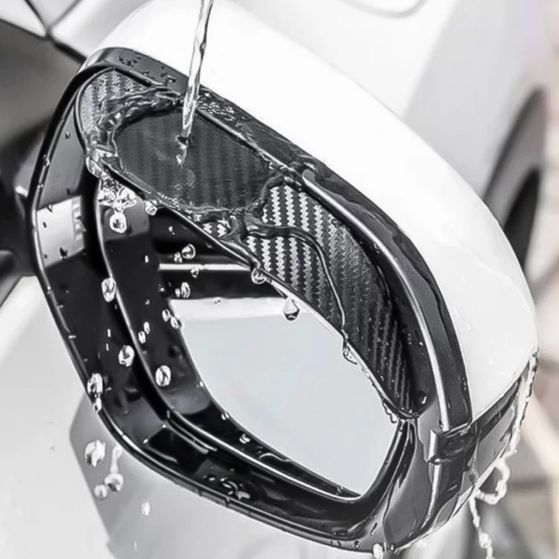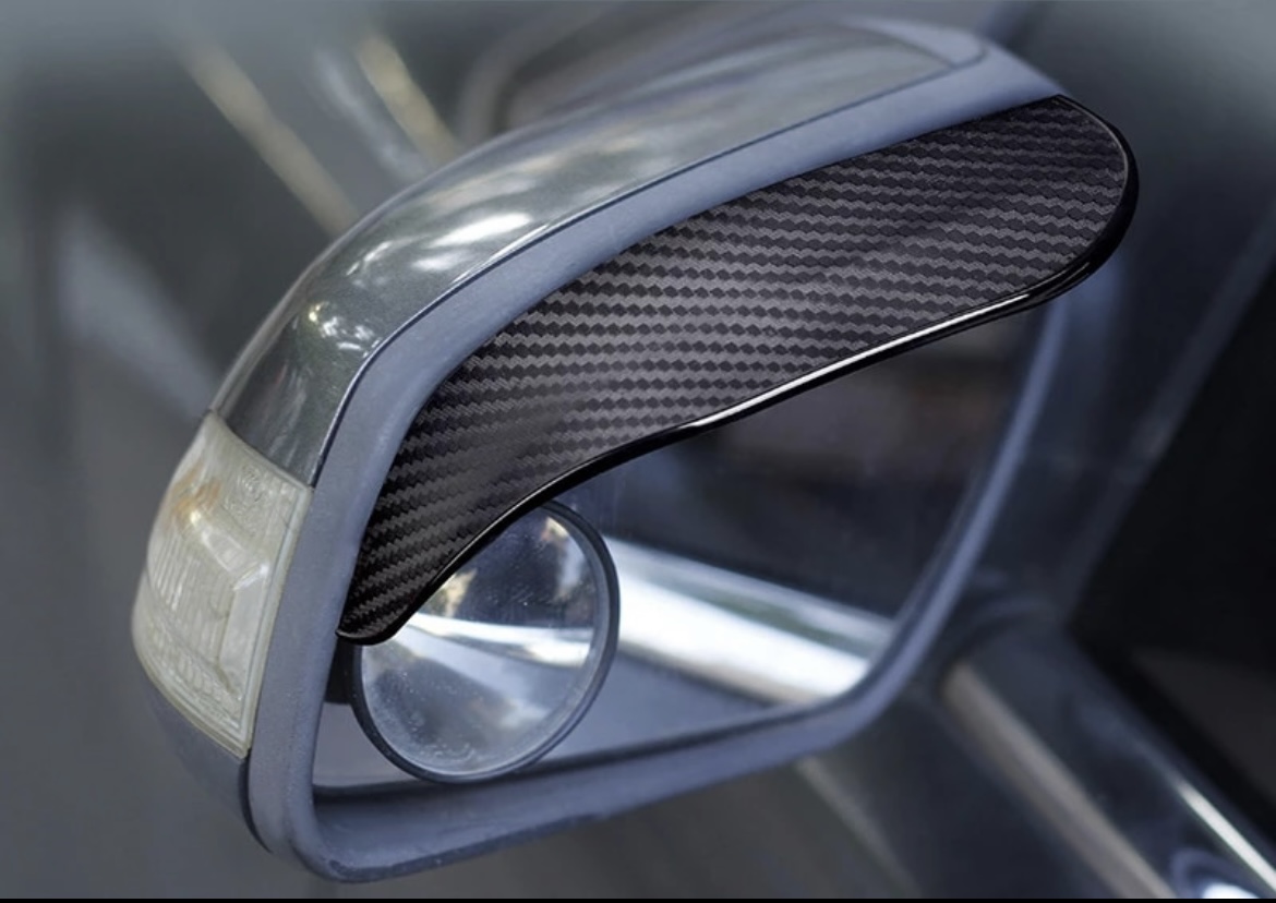 Ett paket (2st) vattenavvisande skärmar (regnskydd) i ”kolfiber look” till sidospeglarna. Funkar perfekt ifall du vill slippa få vatten på dina sidospeglar samt som en snygg accessoar till din bil. Sätts dit enkelt med dubbelhäftande tejp som finns på produktens baksida.