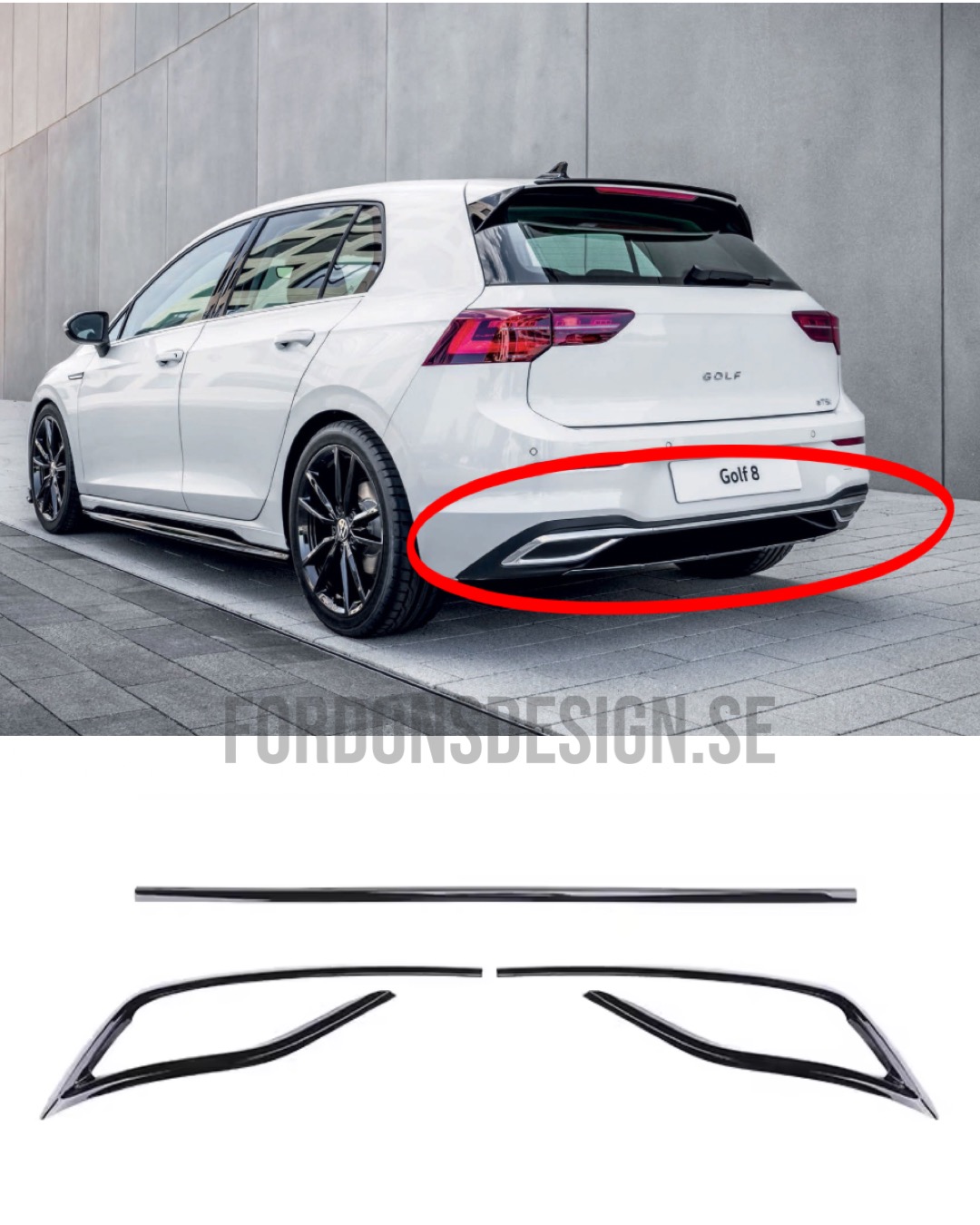 Volkswagen Golf MK8 bakre diffusor trim i svart färg, en kåpa som sätts över de befintliga delarna för att slippa all krom. Perfekt vid ”chromedelete” av en bil. Det är en 3 delad kåpa som täcker hela den kromade delen på diffusorn/stötfångaren ni ser på produktbilden. Går runt ”ändrören” och sträcker sig hela vägen till det andra ”ändröret”.